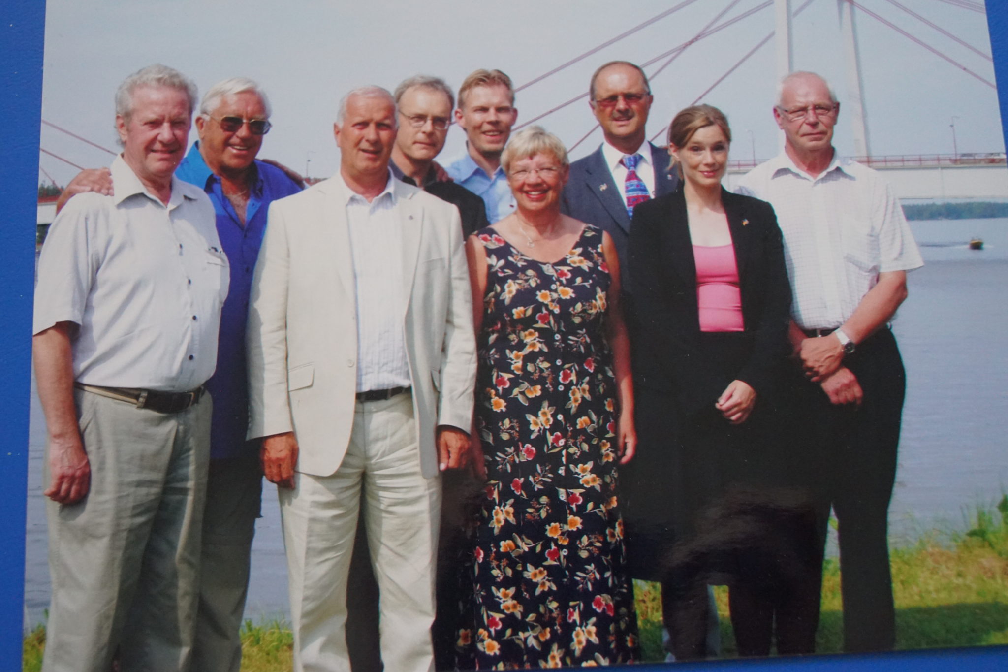 Från 50-årsjubileet av brobygget. Här finns bland annat Sigge Eriksson, Daniel Perfect, Lennart Oscarsson, Maggi Mikaelsson och intill henne står handelsattachén från Tysklands ambassad. samt ytterligare utländska deltagare. Arkivbild Barbro Ericson